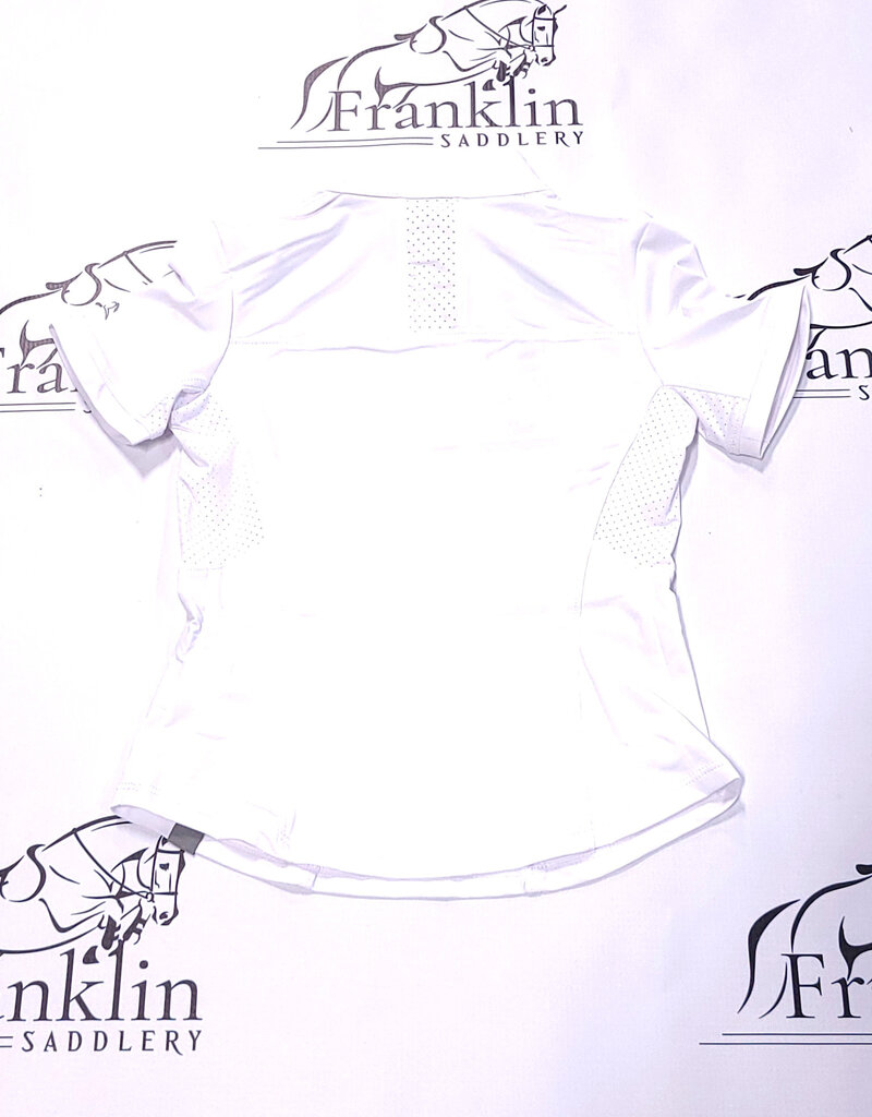The girl's Brynn Jr show shirt features classic styling with silky cooling fabric, perforated panels, hidden zipper and snap collar. White with "Doxies" pattern inside collar.