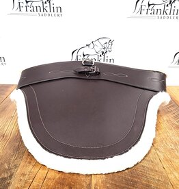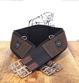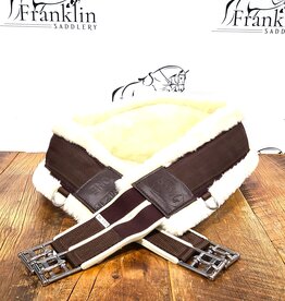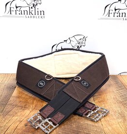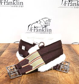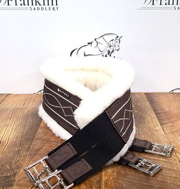 This anatomical girth from Jump'In is made of nylon with a synthetic sheepskin lining. It also has double elastic ends with stainless steel roller buckles, two D-rings on the side and one carabiner in the middle. Brown with cream colored lining.