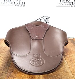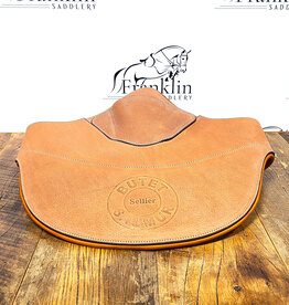 The asymmetric girth from Butet is made from padded grained leather with calfskin lining and elastic straps on one side only. No D-rings. Gold colored leather, 48"-54".
