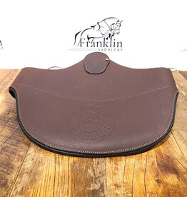 The classic symmetric girth from Butet is made from padded grained leather with calfskin lining and features double elastic ends and three D-rings. Cachou colored leather, 48" or 54".